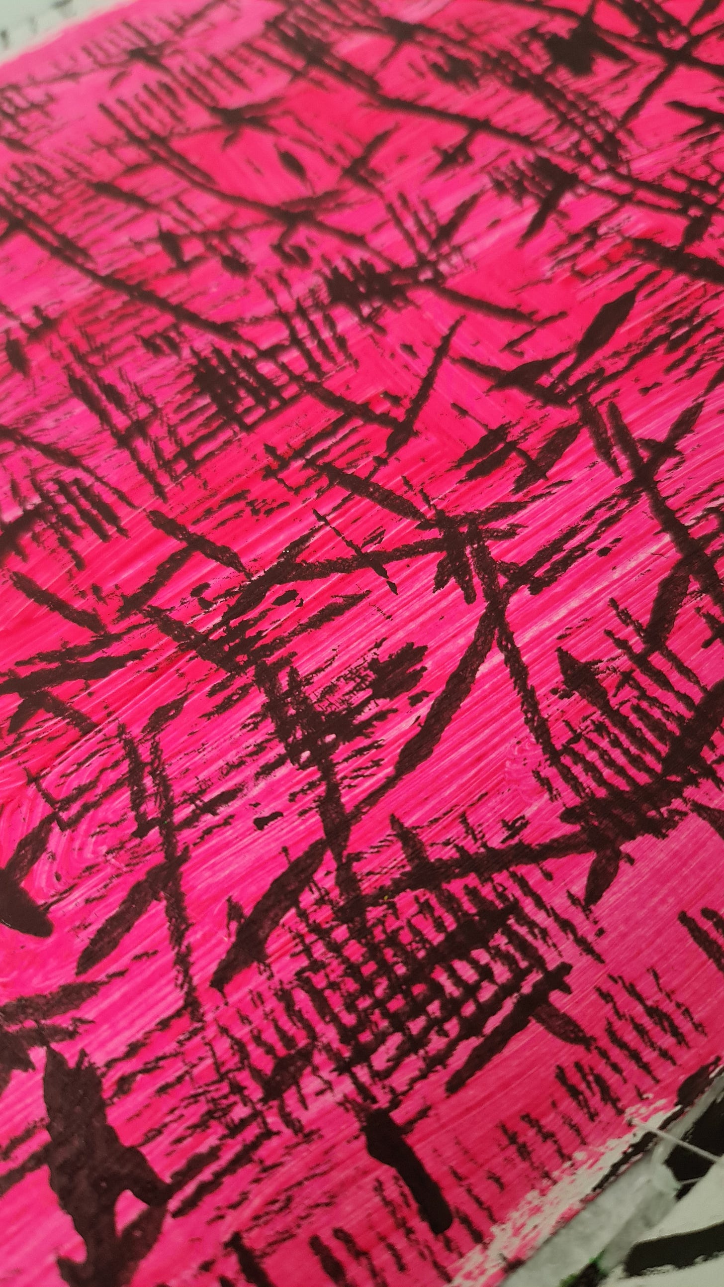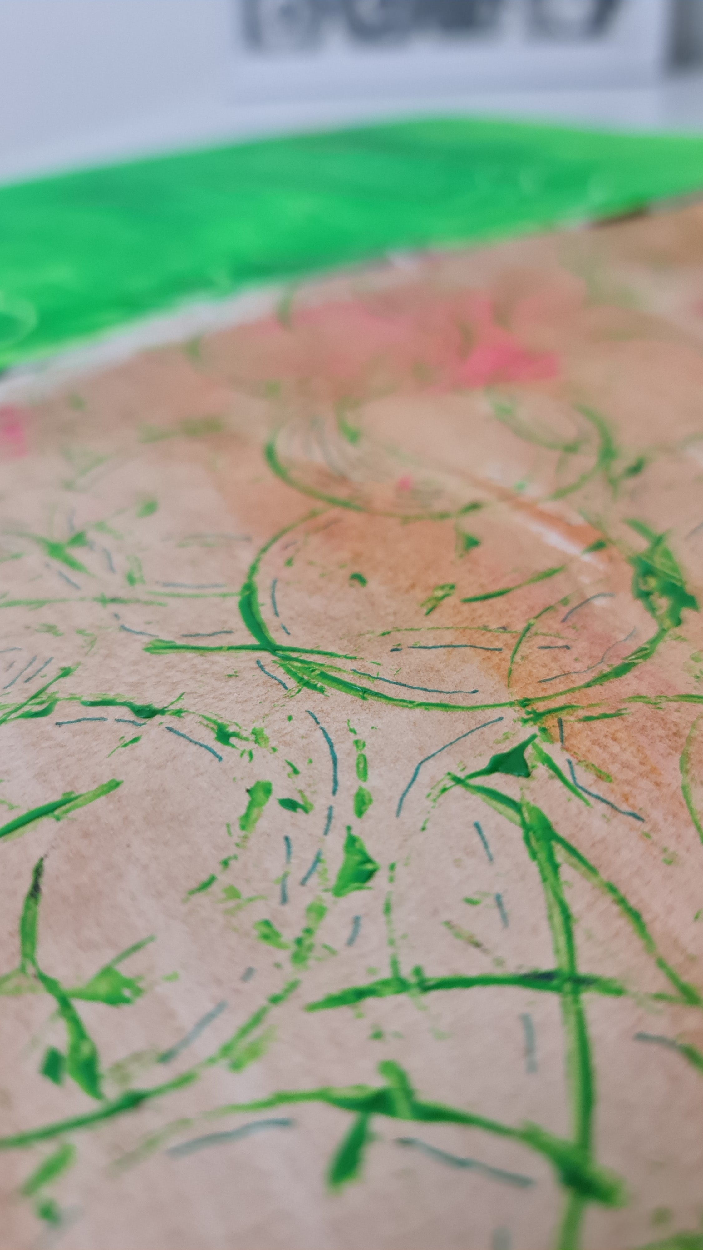 Instead, I move waway from picture-perfect landscapes. I stick lemon ends into inky black calligraphy ink. I scratch lime green acrylic paint with the end of a cheap paintbrush. I stamp the sides of a ball of string onto neon pink acrylic paint. The end result may not look the prettiest, but its artistic expression in a way that I am learning is still art.